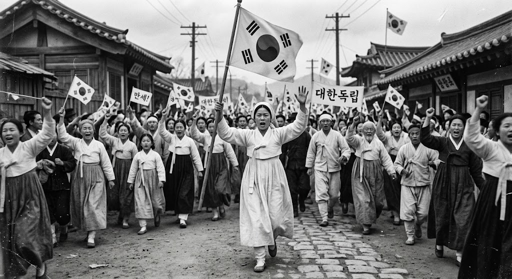 운명의 날, 수천 명의 민중이 모인 아우내 장터에서 유관순은 직접 만든 태극기를 나누어 주며 선두에 섰습니다. 그녀의 목소리는 장터를 울렸고, 평화로웠던 시장은 독립을 향한 열망으로 가득 찼습니다.